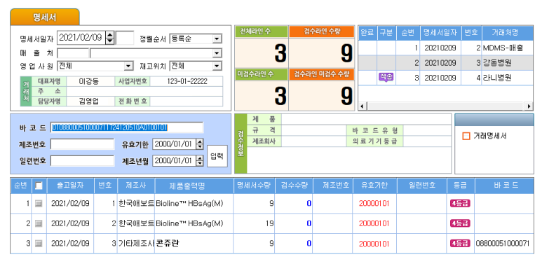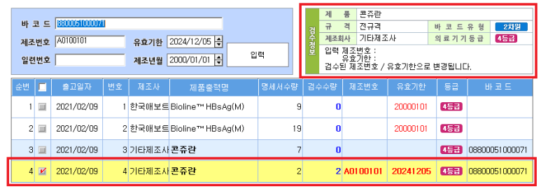 2) 품목의 UDI-DI, PI 정보가 스캔되어 매출검수 수량이 자동으로 카운드