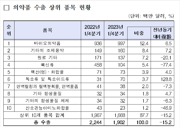 의약품의 경우 바이오의약품과 독소류 및 톡소이드류 수출 증가에도 불구하고, 백신류의 수출 감소로 의약품 수출은 전년 동기 대비 15.2% 감소한 19억 달러를 보였다.