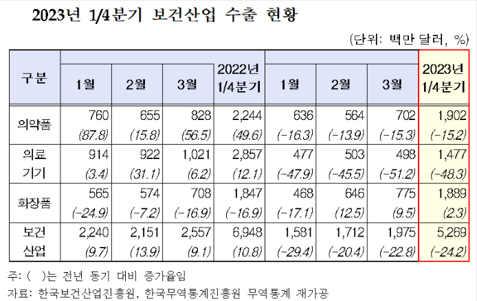 한국보건산업진흥원(원장 차순도)은 2023년 1/4분기 의약품·의료기기·화장품 등 보건산업 수출 실적을 22일 발표했다.