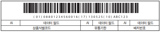 바코드에 부가정보를 표준화된 방식으로 입력하기 위해서는‘GS1 응용식별자(Application Identifier, AI, 이하‘응용식 별자’)’를 사용해야 한다. 응용식별자란 바코드에 부가정보 입력 시 부가정보의 종류와 형식을 지정해주는 일종의 지 시자(Identifier)로 부가정보 바로 앞에 표시하는 2∼4자리의 숫자를 지칭한다. 배치번호, 유통기한, 규격, 수량 등 여러 가지 상품 부가정보를 식별코드와 함께 바코드로 표시하는데 사용되며 국제표준이다. 아래 그림은 응용식별자가 사용되는 예를 보여준다. 여기서 괄호 안에 들어 있는 01, 17, 10은 각각 그 다음에 오는 숫자 또는 문자들이 의미하는 내용을 지시하는 응용식별자이다. (01)은 바로 다음에 이어지는 14자리 숫자가 상품식 별코드임을, (17)은 이어지는 6자리 숫자가 유통기한임을 나타낸다. 응용식별자에 이어서 등장하는 데이터 필드는 숫 자, 문자 또는 숫자와 문자의 조합으로 구성되며 식별자의 종류에 따라 고정길이 또는 가변길이 데이터 값을 갖는다. 응용식별자는 육안식별이 가능하도록 괄호를 쳐서 구분하지만 바코드에 괄호는 입력하지 않는다.