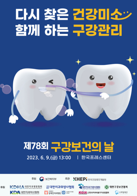 [데일리팜=강신국 기자] 대한치과의사협회(회장 박태근)는 6월 9일 제78회 구강보건의 날을 맞아 코로나 시대의 종식을 선언하면서 마스크 속에 감춰있던 구강상태를 점검하고 구강관리의 중요성을 되새기기 위한 의미의 슬로건을 ‘다시 찾은 건강 미소, 함께 하는 구강 관리’로 정하고, 구강보건에 대한 국민의 이해와 관심을 높이기 위한 구강보건의 날 캠페인을 개최한다고 31일 밝혔다.