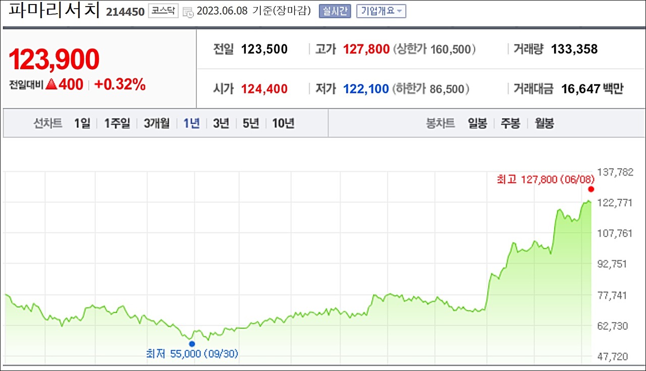파마리서치는 8일 12만3900원으로 장을 마감했다. 52주 '최고'며 시가총액은 1조2522억원이다.