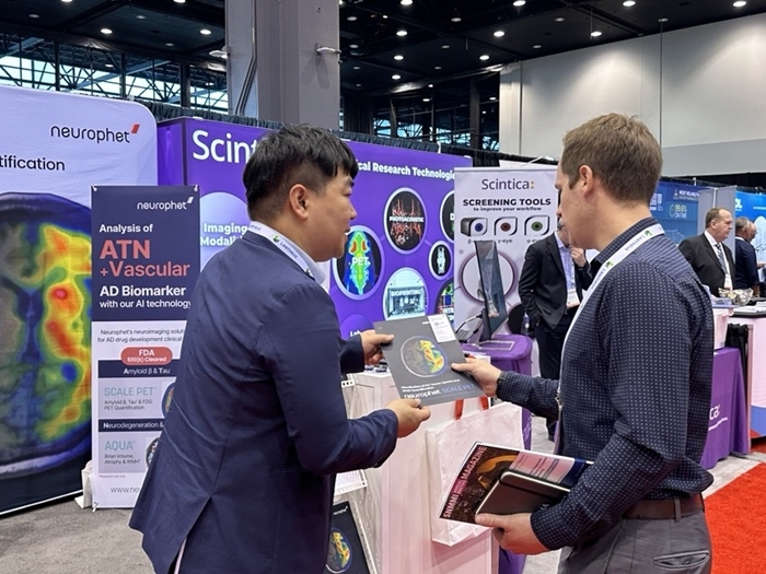 이번 학회에서 뉴로핏은 부스 전시를 통해 PET 영상 자동 분석 소프트웨어 '뉴로핏 스케일 펫(Neurophet SCALE PET)'을 소개했다. 뉴로핏 스케일 펫은 PET(양전자 방출 단층 촬영) 영상과 MRI(자기공명영상)를 활용해 알츠하이머병 바이오마커를 정량적으로 분석하는 소프트웨어다.