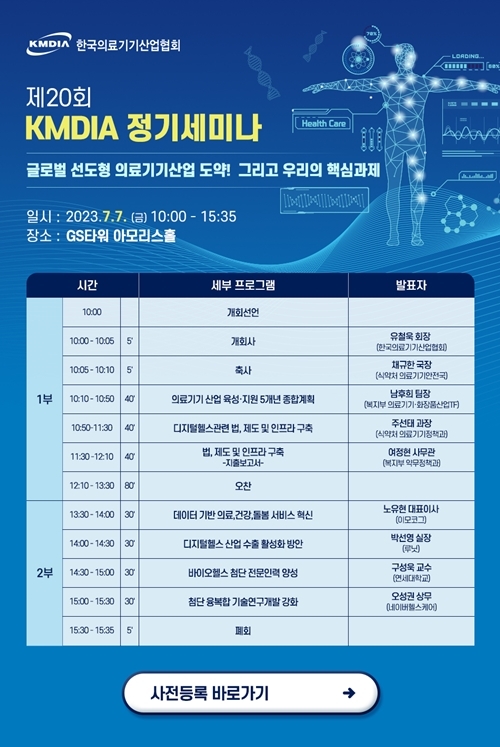 한국의료기기산업협회(회장 유철욱)는 오는 7월 7일 협회 설립 24주년을 기념하고 의료기기산업 성장 발전을 선도하기 위해 '제20회 KMDIA 정기세미나'를 GS타워 아모리스홀에서 개최한다고 밝혔다.
