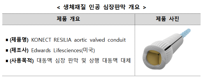이번에 지정한 제품은 대동맥 근부가 늘어나거나(대동맥류) 찢어져(대동맥박리) 해당 부위를 인공판막과 혈관으로 교체하는 수술에 사용되며, 판막(생체재질)과 혈관이 결합되어 있는 제품이다.