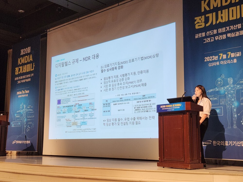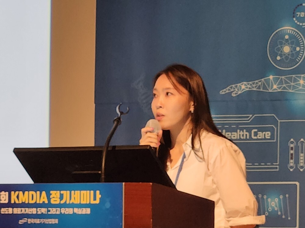 설명: 루닛 박선영 사업전략실장이 KMDIA 정기세미나에서 국내 디지털헬스 기업들의 해외진출 확대를 위한 방안에 대해 발표하고 있다.
