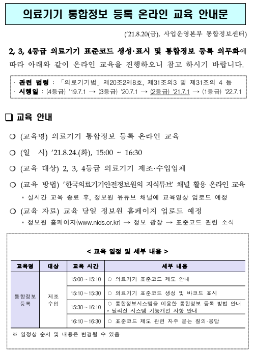 한국의료기기안전정보원(NIDS)에서 의료기기 통합정보 등록 온라인 교육이 2021년 8월 24일 진행되었습니다.