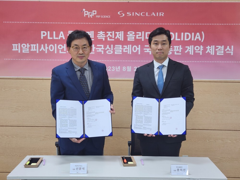싱클레어 코리아 문지선 대표와 PLLA 의료기기 제조 전문기업 피알피(PRP) 사이언스 신문석 대표는 최근 서울 송파구 싱클레어 본사에서 PLLA 콜라겐 촉진제 올리디아 국내 총판 계약을 체결했다.
