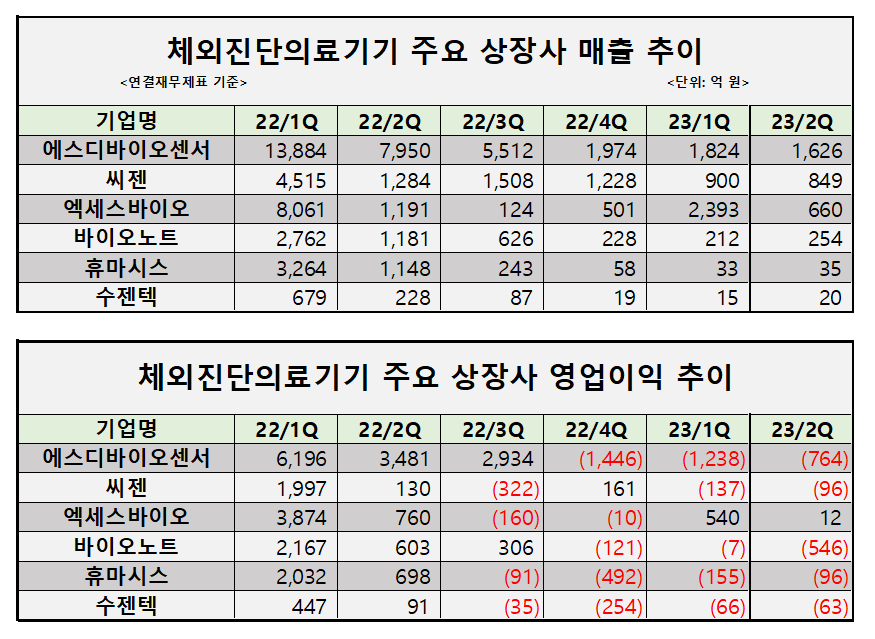 [메디파나뉴스 = 최성훈 기자] 국내 체외진단의료기기 주요 상장 기업들의 올해 2분기 성적표 역시 아쉬움을 자아냈다. 대부분 기업들이 2~3분기 연속 영업 손실을 내며 경영 침체기를 겪으면서다.