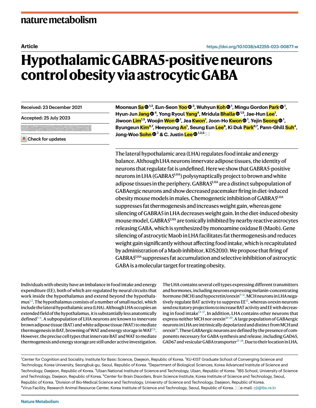 세계적 학술지 '네이처 메타볼리즘' 게재