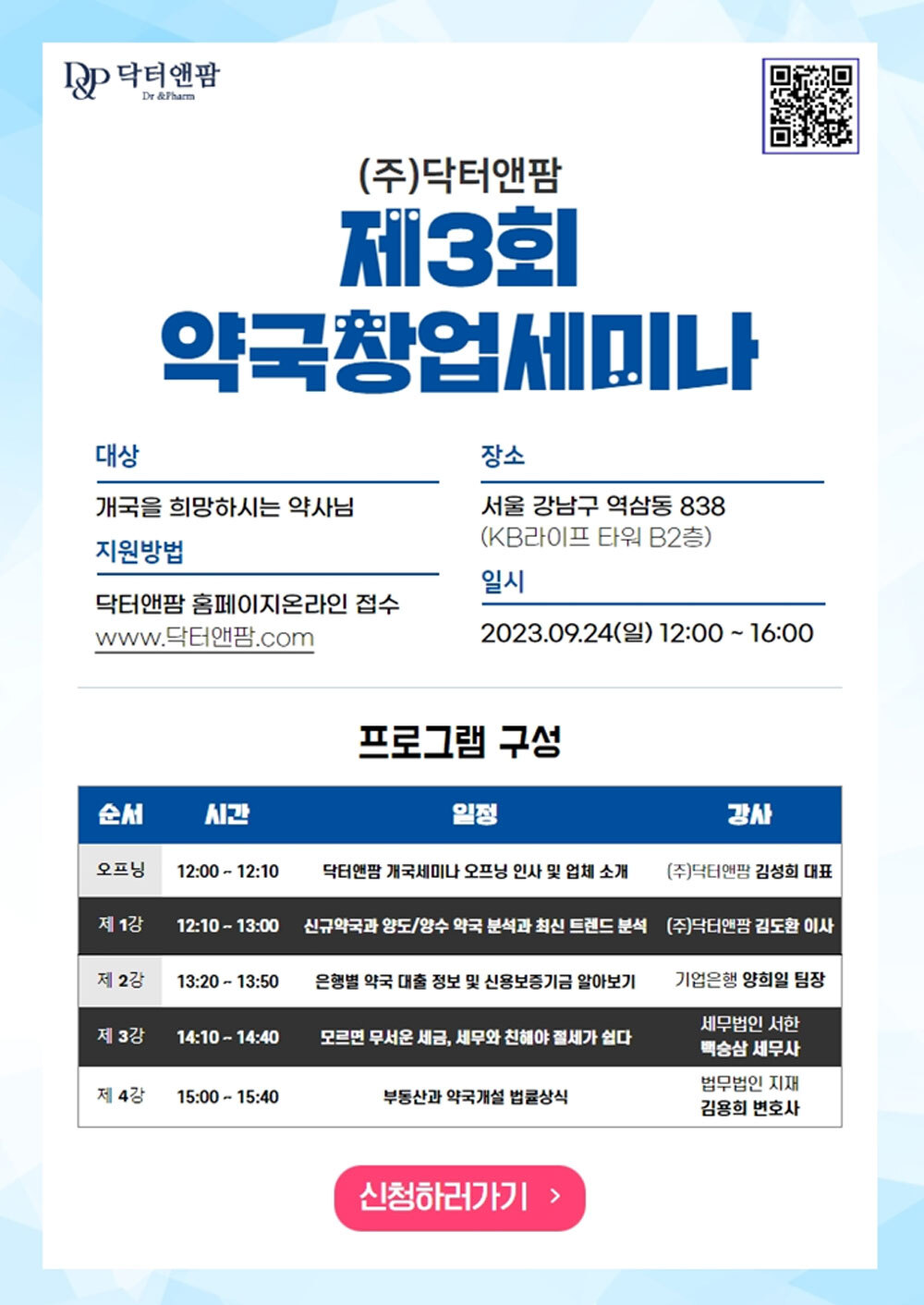 한편 이번 세미나는 KB라이프타워 B2층에서 진행되며, 자세한 정보는 닥터앤팜 홈페이지를 통해 확인이 가능하다.