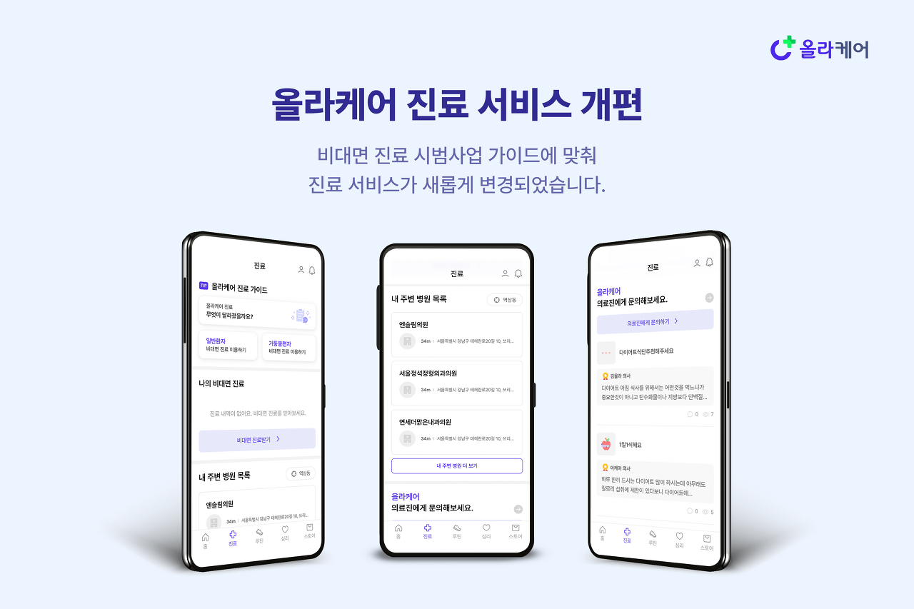또 다른 플랫폼 업체 '올라케어'도 비대면 진료 가이드라인 맞춰 앱 개편 및 신규 서비스 도입했다.