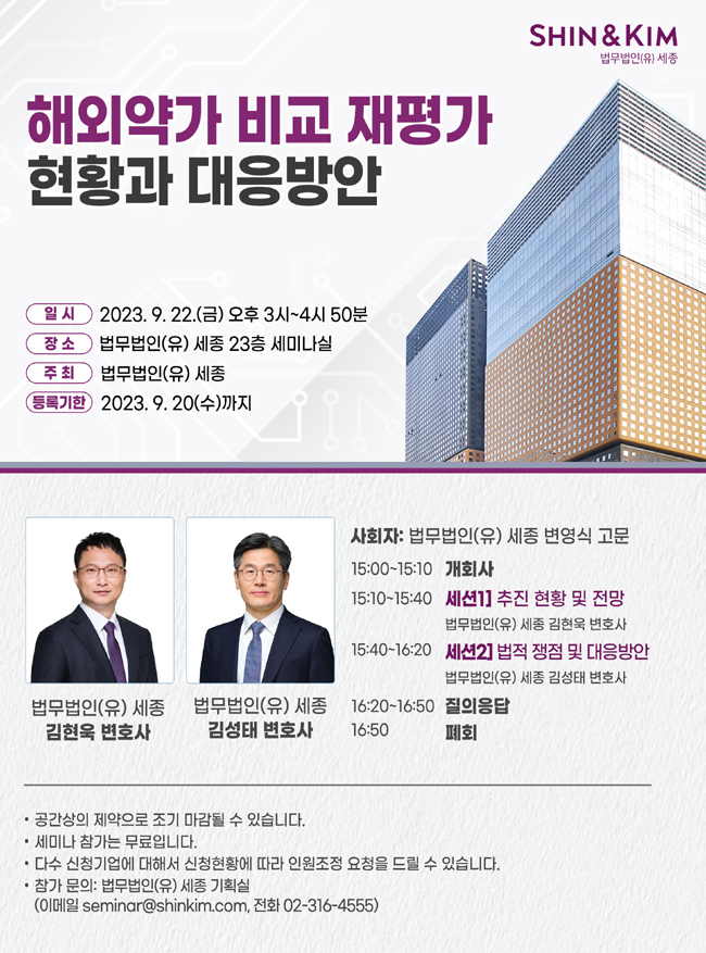 [데일리팜=이혜경 기자] 법무법인(유) 세종(이하 세종)이 오는 9월 22일 '해외약가 비교 재평가 현황과 대응방안'을 주제로 세미나를 개최한다.