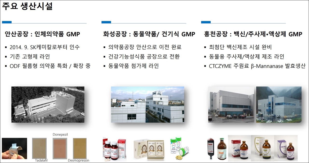 화성공장은 건강기능식품과 동물약품 첨가제를 생산한다. 홍천공장은 백신제조 시설을 완비했다. 동물용 주사제 및 액상제 제조 라인이 있다. CTCZYME 주원료 β-Mannanase 발효 생산을 맡는다. 안산공장은 내용고형제 전용으로 ODF 특화 완제품을 담당한다. SK케미칼로부터 인수한 시설이다.
