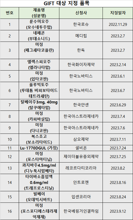 GIFT 대상 품목은 ▲생명을 위협하는 암 등 중대한 질환 또는 희귀질환의 치료를 목적으로 하는 의약품 ▲생물테러감염병 또는 감염병의 대유행 등 공중보건에 심각한 위해를 끼칠 우려가 있는 감염병의 예방 또는 치료를 목적으로 하는 의약품 ▲복지부가 지정 공고한 혁신형 제약기업이 개발한 신약 ▲신속심사 대상 의약품과 의료기기 조합 ▲기존 치료제가 없거나 기존 치료법보다 유효성 등에서 임상적으로 의미 있는 개선을 보인 경우 등에 한정한다.