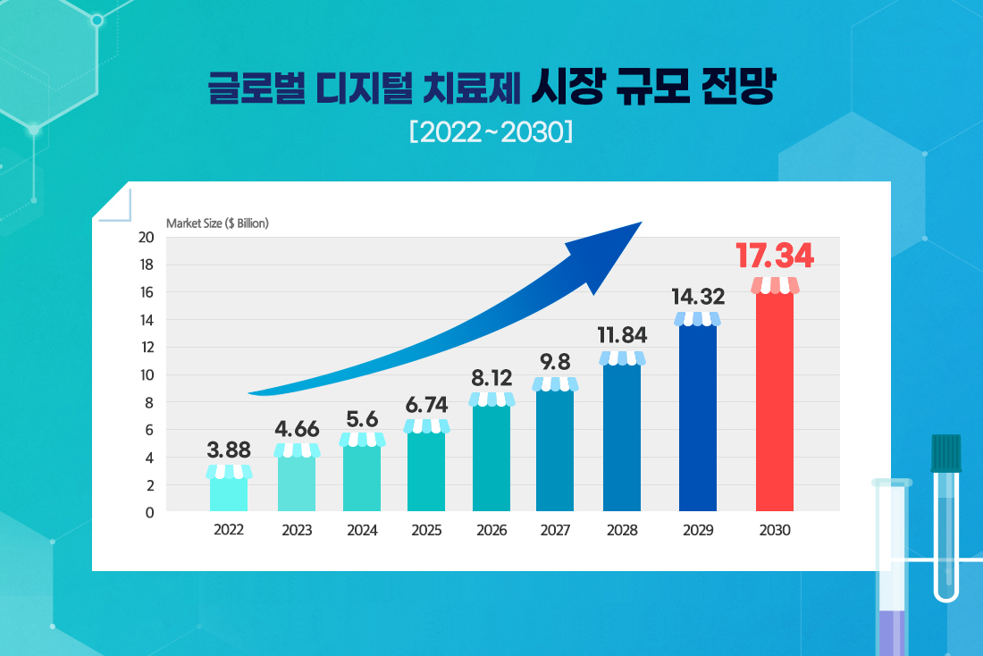 전세계 디지털치료제 시장 규모는 2020년 약 27억 달러(3조8550억원)에서 2021년에는 약 32억3000만 달러(4조6117억원) 규모로 성장했다.