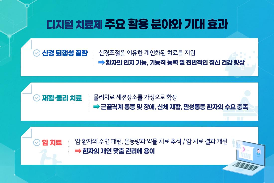 또한, 의료 데이터 세트와 지능형 알고리즘을 사용해 개발된 디지털치료제를 정확한 치료법으로 적용, 표적 치료 및 정밀 치료가 가능하다.