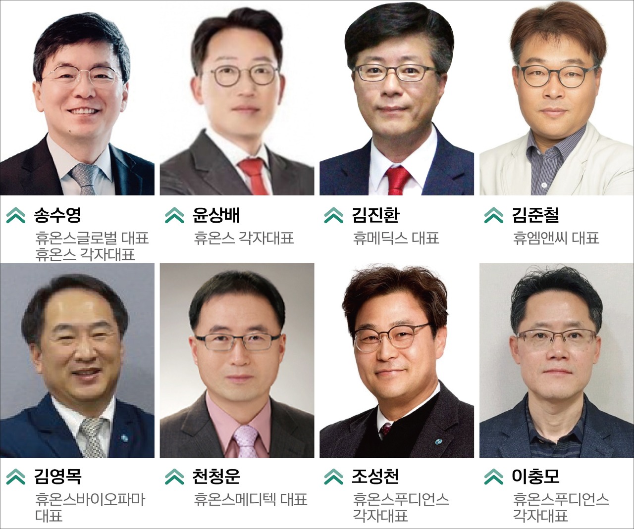 지주회사 휴온스글로벌(송수영 단독대표)을 포함해 휴온스(송수영, 윤상배 각자대표), 휴메딕스(김진환 단독대표), 휴엠앤씨(김준철 단독대표) 등 4개의 코스닥 상장회사와 휴온스바이오파마(김영목 단독대표), 휴온스메디텍(천청운 단독대표), 휴온스푸디언스(조성천, 이충모 각자대표) 등 7곳에 전문경영인 경영을 펼친다.