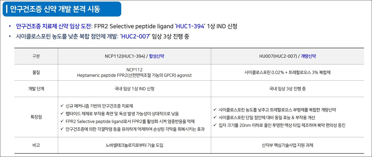 합성신약 NCP112(HUC1-394)은 국내 1상을 신청했다. 노바셀테크놀로지로부터 기술을 도입했다. ▲펩타이드 제제로 부작용 측면 및 독성 발생 가능성 상대적 맞음▲FPR2 활성화 염증반응 억제 ▲안구건조증에 의한 각결막염 등을 유의하게 억제 손상된 각막 회복 등이 특징이다.