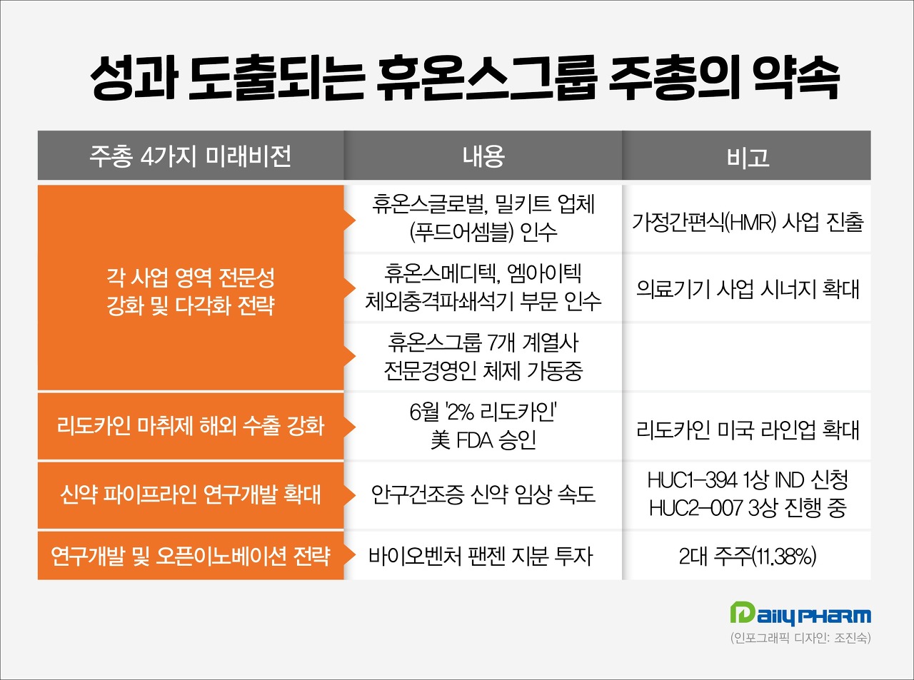 [데일리팜=이석준 기자] 휴온스그룹의 4가지 미래비전이 속속 성과로 도출되고 있다. 그룹은 올 3월 주주총회에서 ▲각 사업 영역의 전문성 강화 및 다각화 전략 ▲리도카인 마취제 해외 수출 강화 ▲연구개발 및 오픈이노베이션 전략 등 미래 비전을 제시했다. 주총의 약속이 실천으로 이어지고 있다는 분석이다.