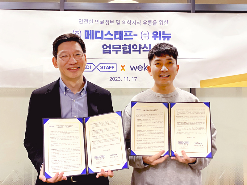 메디스태프(대표 기동훈)와 위뉴(대표 황보율)는 최근 양 기업 간 긴밀한 협력 체계 및 디지털 헬스케어 생태계 구축을 목적으로 업무 협약을 체결했다고 22일 밝혔다.