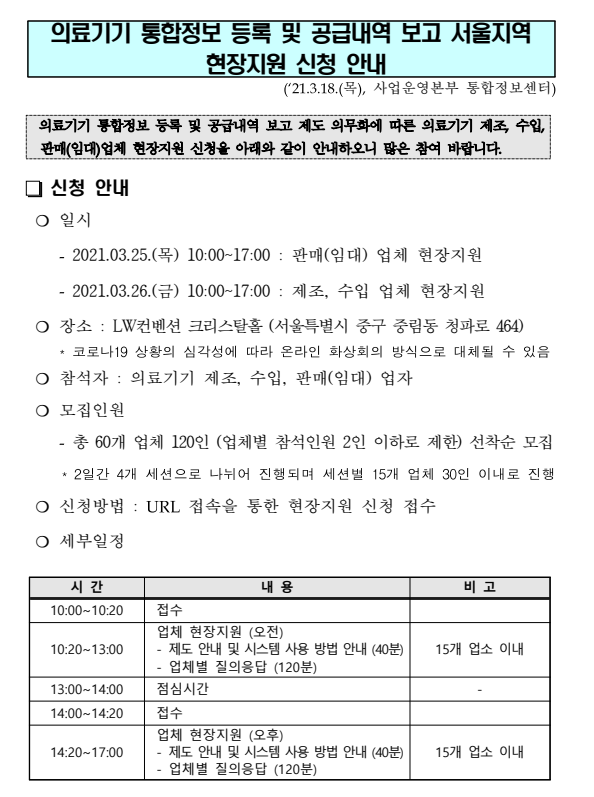 의료기기 표준코드 및 공급내역 보고 서울지역 현장지원을 아래와 같이 진행하고자 하오니