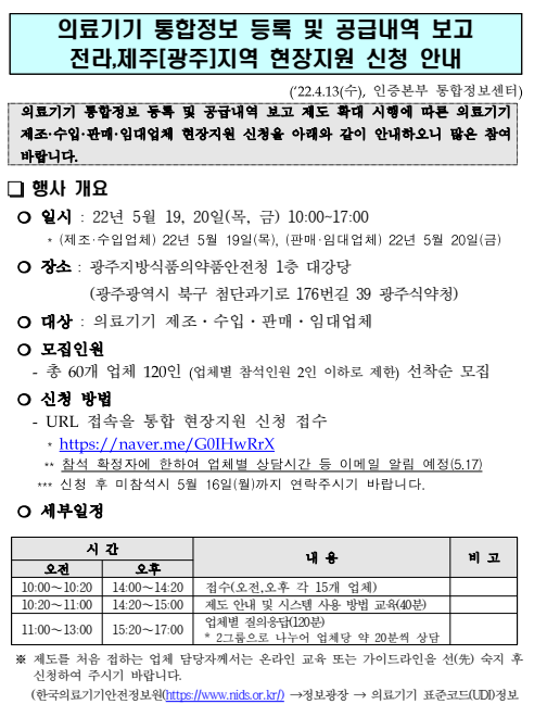 | [현장지원] 의료기기 통합정보 등록 및 공급내역 보고 경상[김해]지역 현장지원 신청 안내('22.5.12~13(목,금)) (0) | 2022.10.26 |
