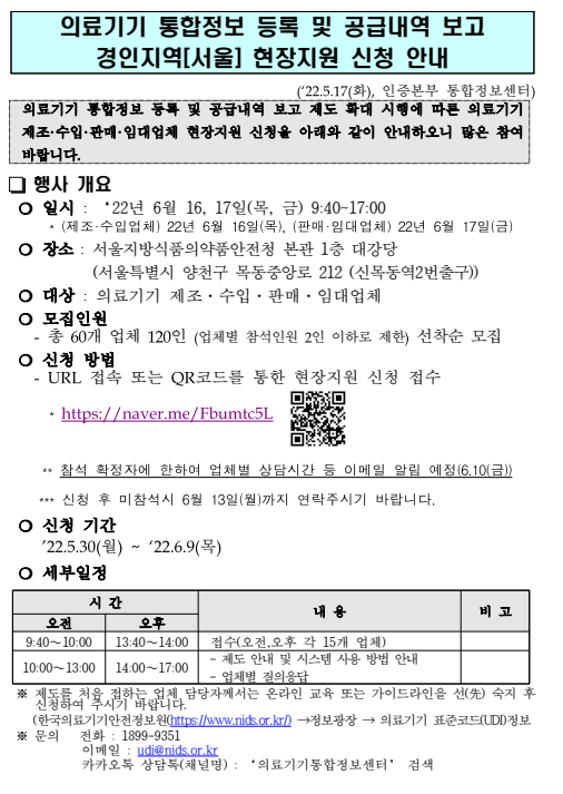 22년 6월 의료기기 통합정보 등록 및 공급내역 보고 현장지원을 아래와 같이 진행합니다.