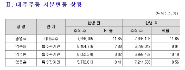 이번 합병으로 한미사이언스 대주주의 지분도 일부 변동됐다. 송영숙 한미약품 회장의 세 남매의 지분이 각각 1~2%p 늘었다.