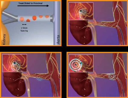 이어 고주파 에너지를 전달할 수 있는 특수 카테터를 신장동맥의 원위부에 위치시켜 내벽으로 고주파에너지를 전달, 혈관 외벽에 분포한 교감신경을 차단한다.