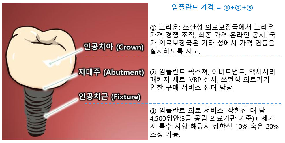 또 임플란트 전 과정의 가격을 조정 공제해 공공 의료기관의 임플란트 비용을 낮추고, 민영 의료기관의 가격을 감독 및 지도한다.