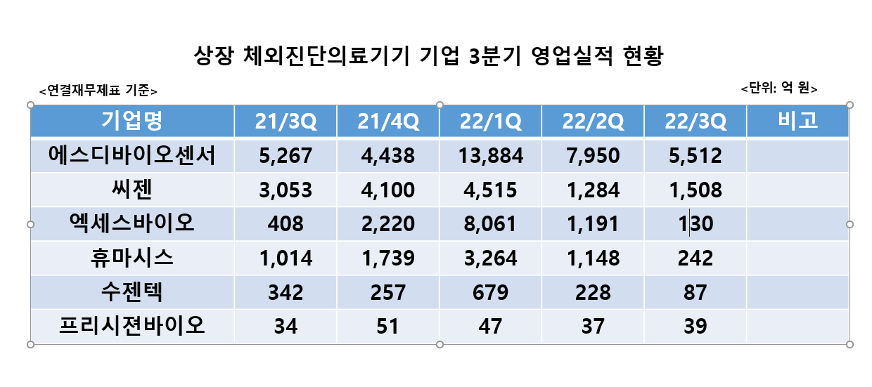 메디파나뉴스가 주요 6개 체외진단의료기기 및 진단시약 기업의 2022년 3분기(연결재무제표 기준) 실적을 집계한 결과, 매출 하락이 두드러졌다.