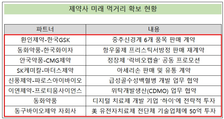시장 관계자는 "제약사들의 공동판매, 타법인 투자, 위탁생산 등 다양한 방식을 통해 미래 먹거리를 확보하고 있다"고 진단했다.