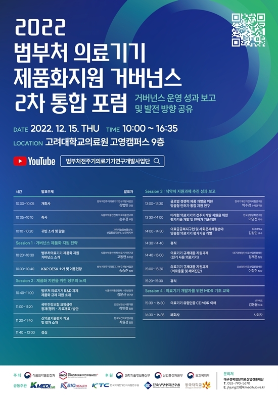 이번 포럼은 ▲범부처의료기기 제품화지원 거버넌스에 대한 소개 ▲식약처 등 의료기기 관련 주요 유관기관의 정책설명 ▲지원과제의 추진성과 등 세 개의 세션으로 나눠 진행될 예정이다.