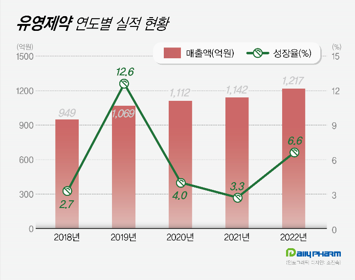 유영제약의 지난해 외형은 1217억원으로 역대 최고 매출을 실현, 2023년 목표 실적은 전년 대비 7% 성장한 1300억원으로 설정했다.