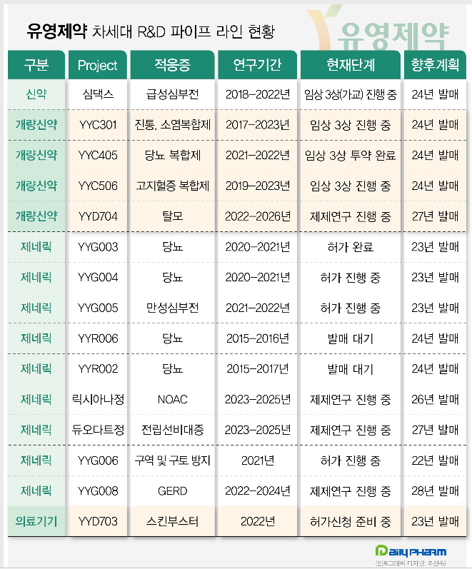 2024년부터는 매해 당뇨복합제 YYC405(임상3상 투약 완료), 고지혈증치료제 YYC506(임상3상 중), 소염진통제 YYC301(임상3상 중) 등 개량신약 4개 제품군이 출시될 예정이다.