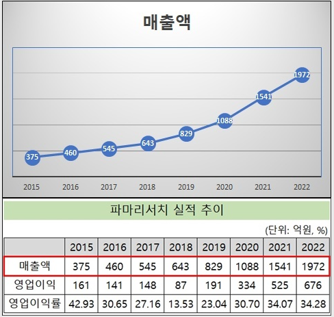 이로써 파마리서치 외형은 2015년 7월 상장 이후 7년만에 5배 이상 확대됐다. 2015년 375억원에서 2022년 1972억원으로다.