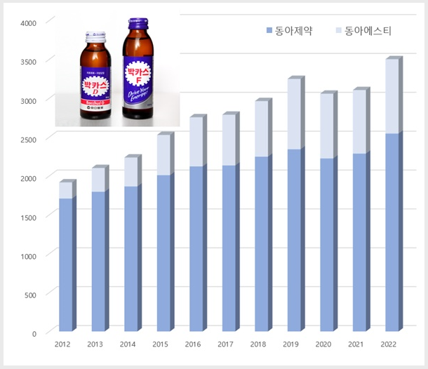 ▲ 연도별 박카스 매출 추이(단위: 억원, 자료: 동아쏘시오홀딩스, 동아에스티)