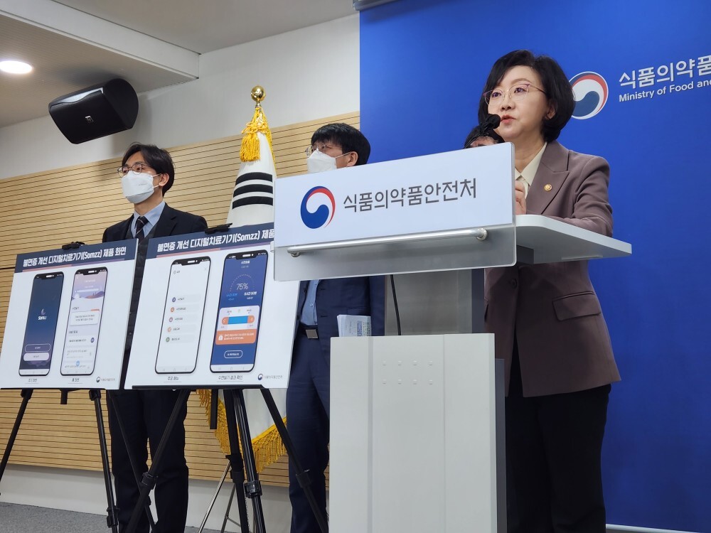 지난 15일 오유경 식약처장이 브리핑룸에서 국내 DTx 첫 허가 브리핑을 하고 있다.