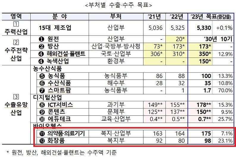 보건복지부는 산업부와 함께 의약품·의료기기 분야 수출을 맡는다. 2021년 163억달러, 지난해 164억달러였던 수출·수주액을 올해 175억달러까지 7.1% 늘리는 것이 목표로 제시됐다.