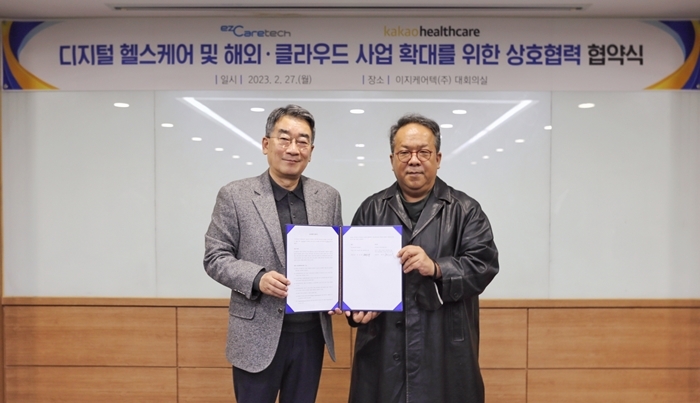 이지케어텍(대표이사 위원량)은 지난 27일 카카오헬스케어와 디지털 헬스케어 및 해외∙클라우드 사업 확대를 위한 상호협력 협약을 체결했다.