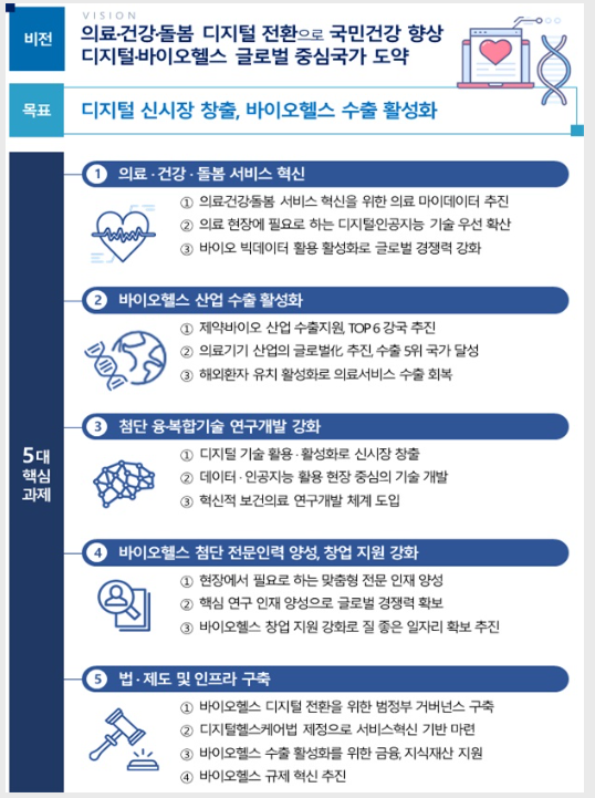 바이오헬스와 디지털 헬스케어 육성방안을 마련하라는 윤 대통령 지시에 따라 복지부는 5대 핵심과제로 구성된 바이오헬스 신시장 창출 전략을 수립했다.