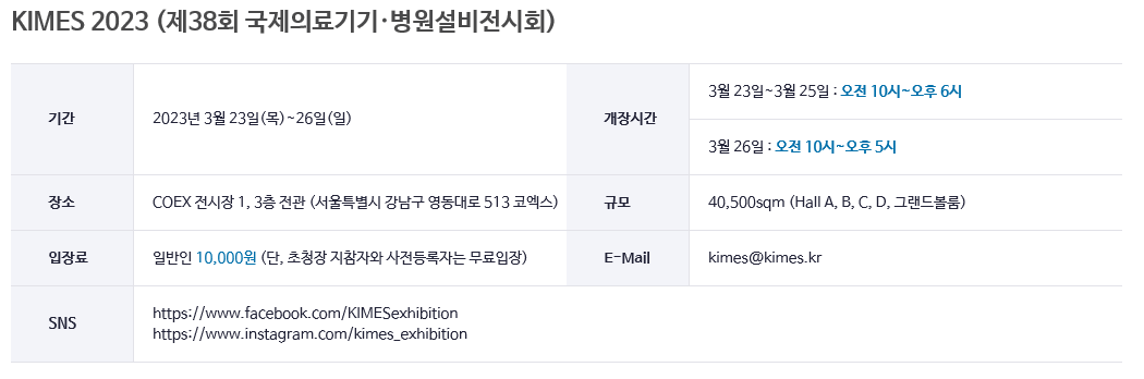 KIMES는 1980년 첫 회를 시작으로 한국의료산업 발전과 함께 꾸준히 성장해 온 한국 최대의 의료기기 및 병원 설비 전문 전시회로, 그동안 국내 의료산업은 눈부신 성장을 하여 의료 정보시스템, 초음파검사기, 영상 의학 장비, 로봇 의료, AI, 재활의약 등 기술집약적 첨단산업으로 변모하였습니다.