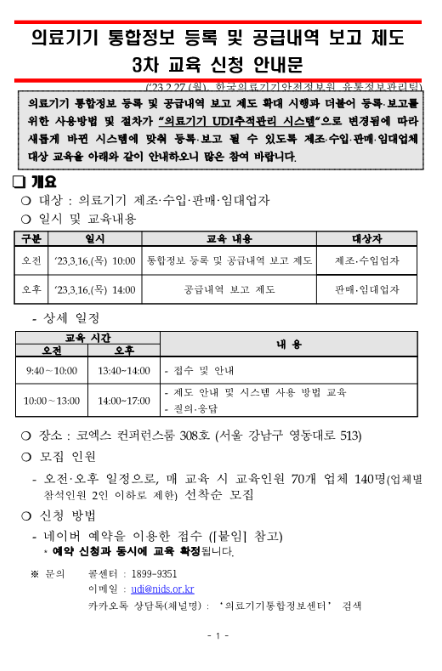 통합정보 등록 및 공급내역 보고 교육을 3월 16일(목) 코엑스 컨퍼런스룸 308호에서 진행하려고 합니다.