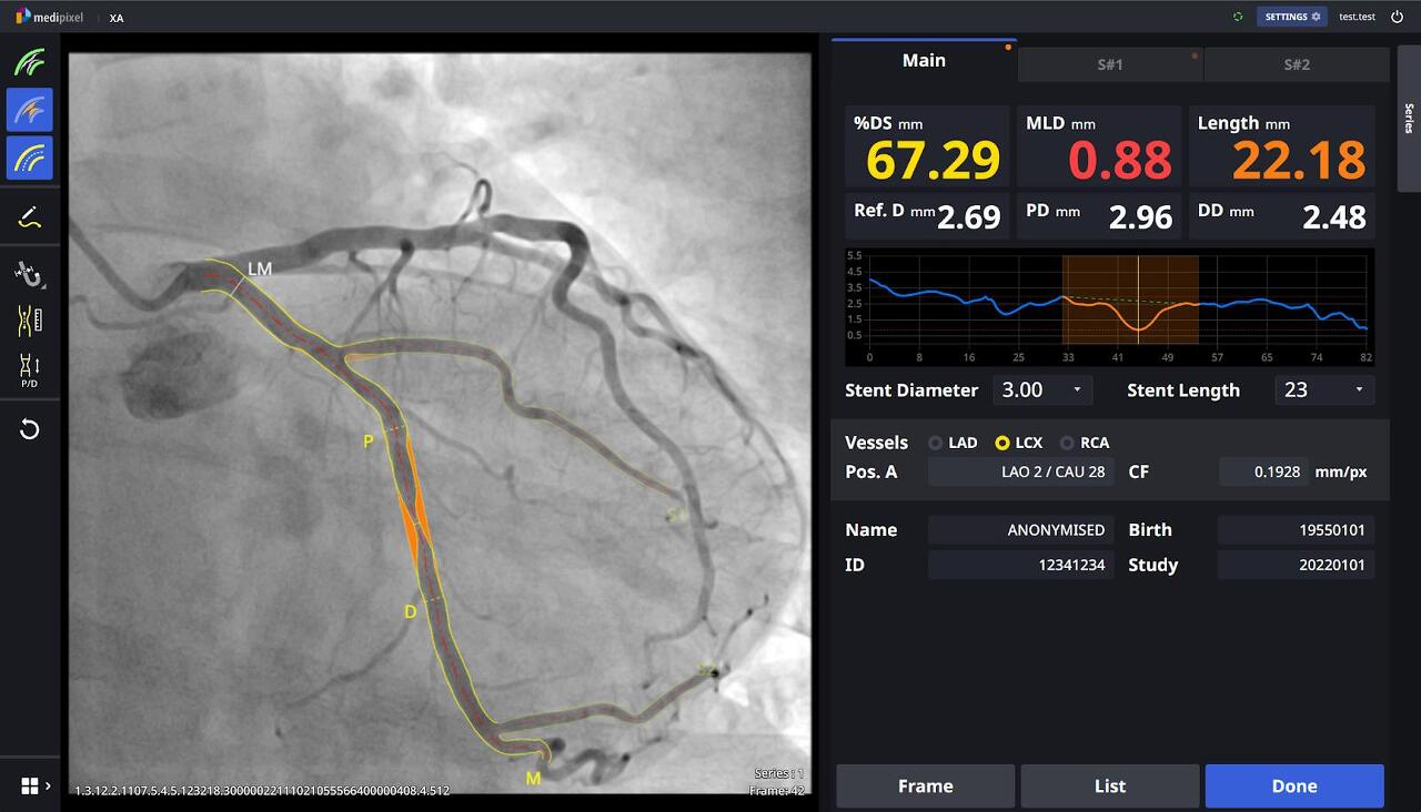 Medipixel XA는 협착이 의심되는 혈관들을 자동으로 검출하고, 의심 부위의 위치 정보와 의심 정도를 수치로 표기해준다.