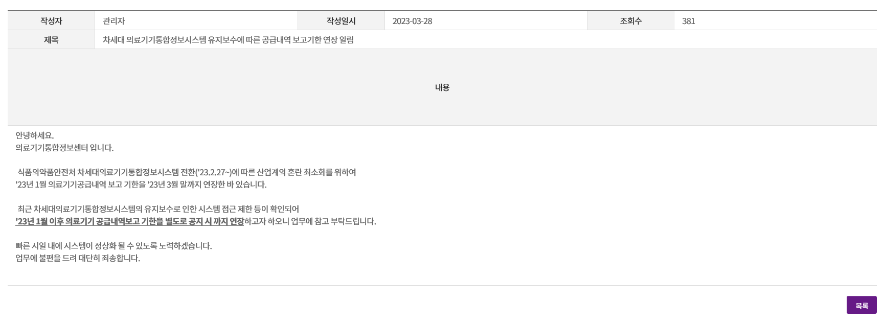 '23년 1월 이후 의료기기 공급내역보고 기한을 별도로 공지 시 까지 연장하고자 하오니 업무에 참고 부탁드립니다.