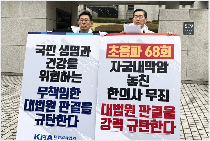 이필수 대한의사협회장과 김교웅 의협 한방대책특별위원회 위원장은 6일 오전 대법원 앞에서 1인 시위를 열고 '한의사 초음파 사용 대법원 전원합의체 판결'에 대한 입장문을 발표했다.