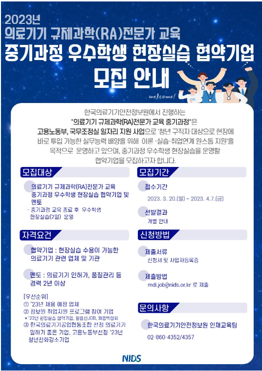 이와 관련하여 `23년도 의료기기 규제과학(RA)전문가 교육 중기과정 우수학생 현장실습을 운영할 협약기업을 모집하고자 하오니, 많은 참여 부탁드립니다.