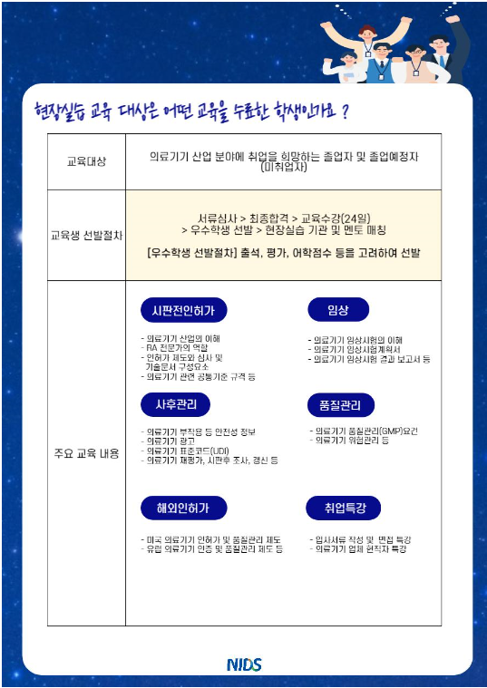 한국의료기기안전정보원은 청년 구직자 대상으로 현장에 바로 투입 가능한 실무능력 배양을 위해 이론·실습·취업연계 원스톱 지원 목적으로 의료기기 규제과학(RA)전문가 교육 중기과정을 운영하고 있습니다.