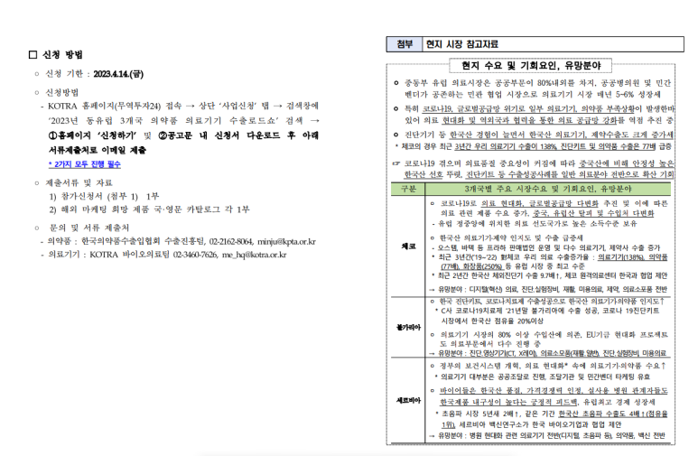 ? 신청방법 - KOTRA 홈페이지(무역투자24) 접속 → 상단 ‘사업신청’ 탭 → 검색창에 ‘2023년 동유럽 3개국 의약품 의료기기 수출로드쇼’ 검색 → ①홈페이지 ‘신청하기’ 및 ②공고문 내 신청서 다운로드 후 아래 서류제출처로 이메일 제출